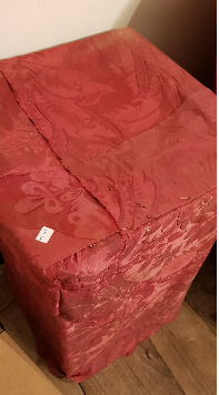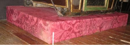 Soporte de forma rectangular donde está apoiada a liteira, en madeira tapizada con tea de damasco de seda natural de cor vermello.(A tea de damasco pertence ao século XVIII).