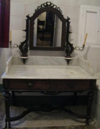 Moble toucador en madeira de castiñeiro, con dous caixóns frontais e meseta en mármore; espello central surmontado con ornamentación rococó de lazos drapeados e cadanseu candeeiro de bronce nos laterais. Sobre catro patas de trompeta, semellantes ao estilo Adam e con chambrana disposta en aspa, de perfil curvo, con repisa central de base circular para almofía.