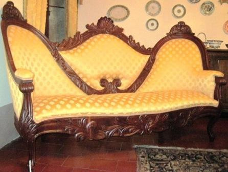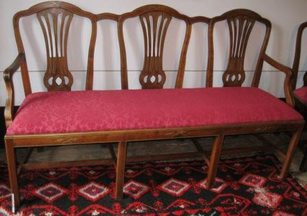 Sofá canapé de tres prazas en madeira de caoba, con apoiabrazos. Apoiado en 8 patas afusadas unidas por travesaños. Asento acolchado en tea adamascada de cor granate. Decoración de rameados sobredourados nos frontais e unha sorte de lira no respaldo (en realidade tipo shieldback), ao estilo Imperio ou Country Chippendale interpretado por Dunchan Phyfe. Da casa Cabezas, en Chantada, réplica do mesmo canapé do cuarto do Bispo. Froito dun encargo de José Taboada Zúñiga.