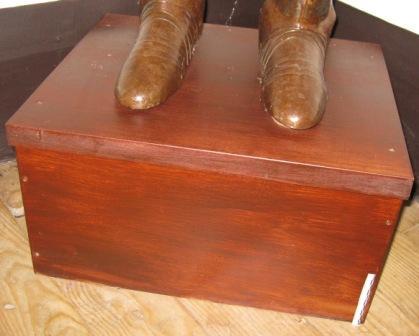 Peaña baixa de planta cadrangular en madeira de castiñeiro con repisa voada perfilada cun filete e pé de antepeito sobre arco moi apaisado. Nun dos laterais, debuxado a plumilla por D. Benxamín de Prado, o escudo de armas do apelido Taboada-Zuñiga.