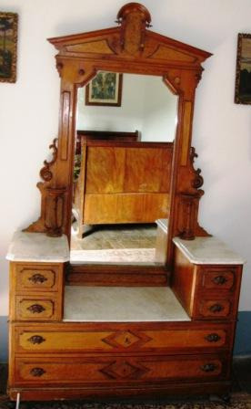 Moble toucador con espello central con duas repisas elevadas nos laterais e cadanseu caixón; na parte inferior dous caixóns grandes. Apoiado en catro pés e meseta en mármore. Rematado en frontón recto partido para aloxar un edículo coroado por tímpano semicircular. Flanqueado o espello por volutas acantizadas.