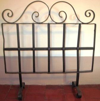 Reixa protectora de cheminea en ferro forxado, de forma rectangular. O panel, en forma de grella cadrangular, vai apoiada en dúas zapatas e leva un copete formado por dúas volutas forxadas afrontadas.