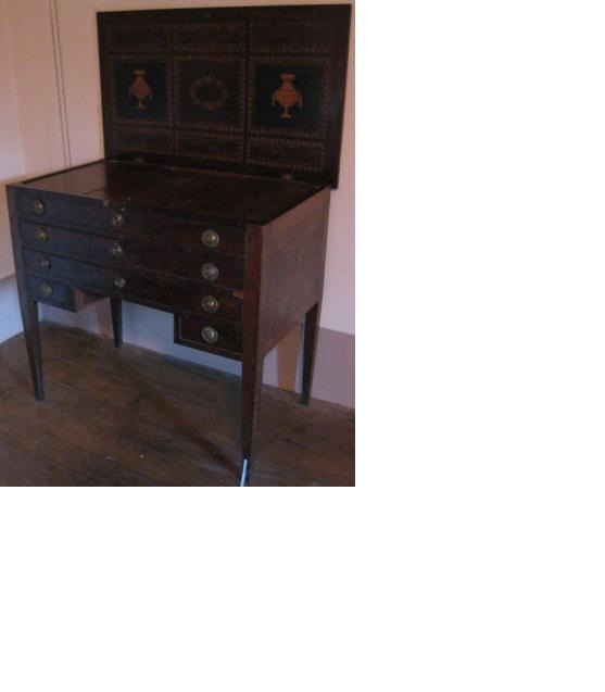 Toucador estilo Carlos IV con embutidos en marquetería de madeiras nobres con dous caixóns pequenos, outros dous máis grandes e, na parte superior, tres apartamentos para gardar obxectos; na central, un marco para un espello móbil, a modo de psiqué. Tiradores en bronce e tapadeira abatible. Patas afusadas e motivos ornamentais estilo Imperio (xarróns e grilanda floral central)