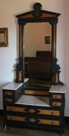 Toucador en madeira de distintos tons (negro e claro) con espello biselado flanqueado por fragmentos de voluta acantizada. Na parte inferior dous caixóns e dous altillos tamén con outro dous caixóns a cada lateral, repisas en mármore branco. Tiradores en madeira tallada e apoiado en catro pequenos pés. Remate en forma de tímpano recortado para fornecer un pequeno edículo.