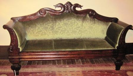 Sofá tipo fernandino con certo deixo isabelino en madeira de caoba. De tres prazas, vai apoiado en catro patas en madeira tallada con motivos gallonados. Asento, respaldo e laterais acolchados e tapizados en tea de veludo adamascado en cor verde. O respaldo, de perfil mixtilíneo, vai decorado con cabezas de cisne enfrontadas e unha palmeta no copete. Os repousabrazos, dispostos ao gusto Imperio, van tallados con motivo acantiforme. O faldón, mínimo, moldurado en bocel.