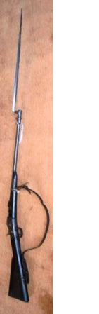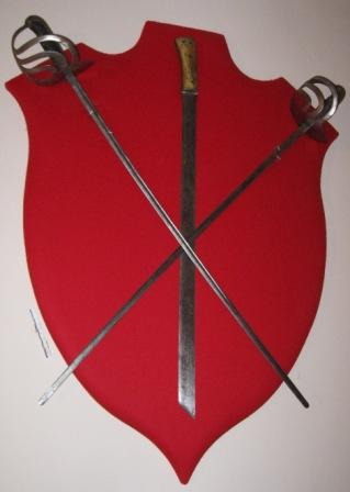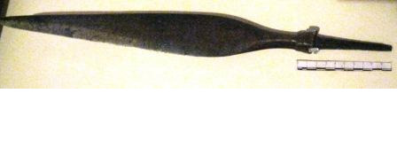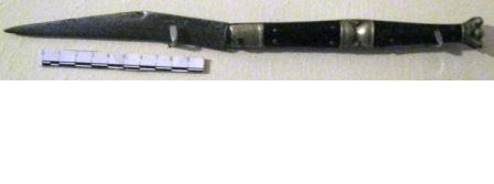 Yatagán pequeno: machete turco coa folla curva dun só fío en aceiro con gravado cincelado decorativo no anverso e reverso, no arranque da folla. Nunha cara, un cervo e motivo acantiforme. Na outra, unha dama pasea o seu can apoiada nunha espingarda. Punzón estampado nun dos lados, frustro. Mango de madeira con remates de alpaca.