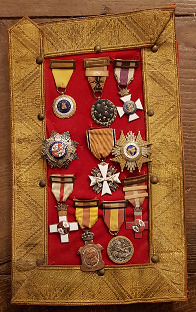 Marco expositor coas condecoracións militares de D. Miguel Ángel Quesada. Contén 9 medallas, algunhas delas con "Sufrimiento por la Patria, premio a la constancia militar, al mérito en campaña...etc"