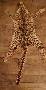 Alfombra dunha pel de leopardo ribeteada en tea vermella.