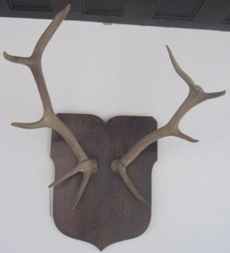 Panoplia en madeira en forma de escudo que suxeita dous cornos de cervo; un de seis puntas e outro de cinco puntas.