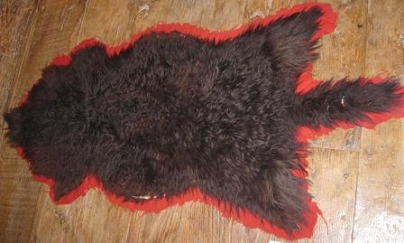 Alfombra de pel de ovella negra, ribeteada con feltro de cor vermella.