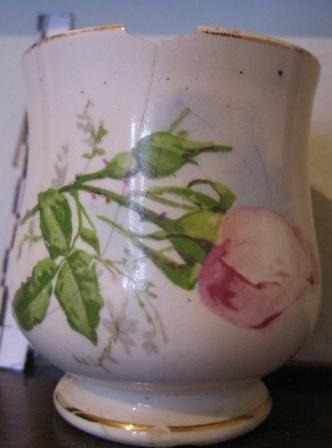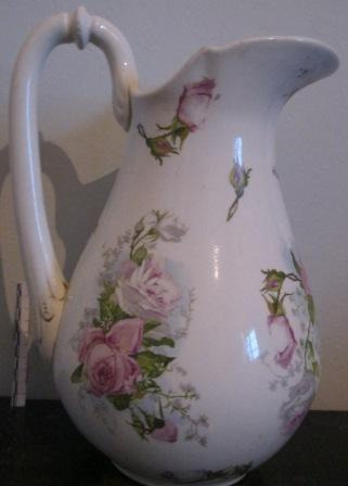 Xerra para almofía en cerámica branca con asa e decorada con motivos florais (rosas), coa súa correspondente estrutura soporte, en madeira de faia, recurvada, ao xeito dos mobles hixiénicos que facía Thonet (peza 924 do inventario).