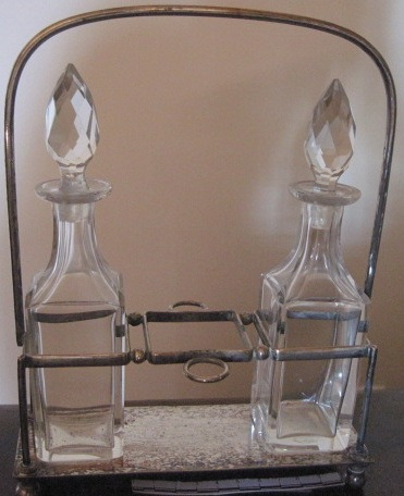 Comboio con asa en prata repuxada cos seus respectivos recipientes para vinagre, aceite, sal e pementa, en cristal. Coa inequívoca decoración modernista de ramallete de flores, a modo de friso, nas caras frontais e laterais. Da casa alemá Seybold & Hirschauer. Leva selo e contraste (800 DRGM) o que axusta a cronoloxía aos anos 10.