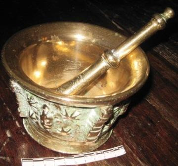 Morteiro en bronce de boca exvasada de perfil convexo, corpo troncocónico invertido seccionado por catro columnas en medio relevo con decoración exterior con catro espigas en relevo e man. Man de perfil circular animada con aneis incisos, bocel central e remate periforme. Base destacada por moldura de asento. Lonxitude man: 11cm.