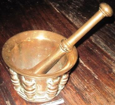Morteiro en bronce de boca exvasada de perfil convexo, corpo troncocónico invertido seccionado por catro columnas en medio relevo con decoración exterior con catro espigas en relevo. Man de perfil circular animada con aneis incisos, bocel central e remate periforme. Base destacada por moldura de asento. Lonxitude man: 11cm.