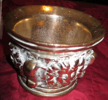 Morteiro en bronce de boca exvasada de perfil convexo e corpo troncocónico invertido decorado con metopado de mascaróns de gusto manierista separados con sereas en resalte. Non conserva a man.