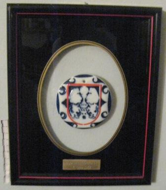 Medallón en cerámica de Sargadelos formando un escudo de bordura vermella. No campo, dous leóns flanquean unha torre coroada pola Sagrada Forma entre nubeiros. O medallón en tons azuis, brancos e laranxas, vai pegado sobre cristal. Na parte inferior unha placa coa inscrición "Amigos de los Castillos, Lugo, 4 de junio de 1989".