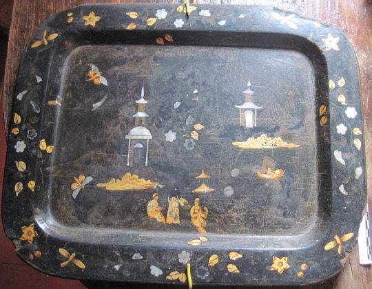 Paneira con asa da 3ª época, personalizada coas iniciais do propietario José María Varela, coengo tesoureiro da catedral de Santiago (posesionouse desa dignidade en 1853). Decoración por estampación calcográfica de chinoiserie e orla corrida chinesca en forma de abanos asociada a un estreito reberete de roleos. Modelos baseados na louza inglesa de Staffordshire propias da época de dirección de Edwin Forester. No reverso, marca estampada mediante tampón con pigmentos sobre o biscoito, modelo "CHINA OPACA/SARGADELOS" nunha filacteria. Dentro do óvalo: "Rª Fábrica"