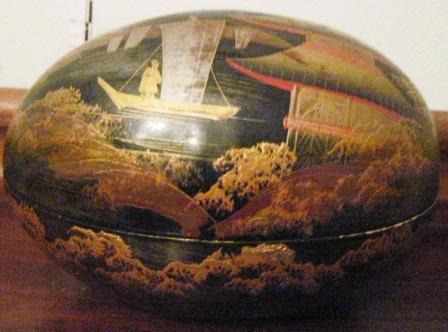 Oveiro "forma de copa" 3ª época personalizado coas iniciais do propietario José María Varela,coengo tesoureiro da catedral de Santiago (posesionouse desa dignidade en 1853). Decoración por estampación calcográfica de chinoiserie e orla corrida chinesca en forma de abanos asociada a un estreito reberete de roleos. Modelos baseados na louza inglesa de Staffordshire propias da época de dirección de Edwin Forester. No reverso, marca estampada mediante tampón con pigmentos sobre o biscoito, modelo "CHINA OPACA/SARGADELOS" nunha filacteria. Dentro do óvalo: "Rª Fábrica"