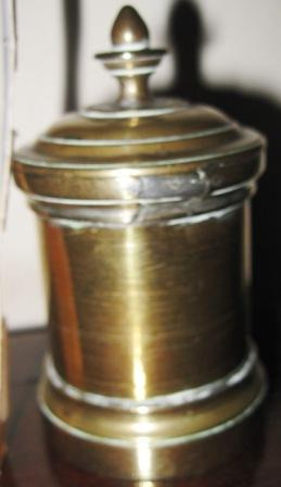 Tinteiro en prata de corpo cilíndrico decorado no imóscapo e sumóscapo con cadansúa cenefa de motivos xeométricos. Tampa en forma de media laranxa moi rebaixada, con cenefa repuxada de láureas dispostas en grilanda, arista concéntrica e botón no remate. Na mesma tapa, o punzón cordobés: león rampante con cola eseada nun cartucho ovoide. Do prateiro cordobés Castejón, marcada polo contraste Torre (véxase a peza 473)
