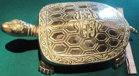 Especieiro triangular empregado como tinteiro, de lados e paredes iguais en cerámica de Puente del Arzobispo; con tres ocos ou depósitos iguais na parte superior, xunto a cada un dos ángulos do triángulo. O anverso executado con esmalte branco de estaño e decoración moldeada a relevo e sobrepintada. En cada un dos laterais un mascarón de león con decoración feita a pincel; motivos vexetais en tons verdes e ocres. Xunto aos ocos, follas tamén executadas a pincel. As aristas tamén van sobrepintadas.