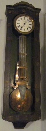 Reloxo de parede José Ramos con péndulo compensador, chamado de grella, de sete variñas en diferentes metais como bronce e zinc; caixa de madeira de castiñeiro decorada con calcomanías.