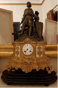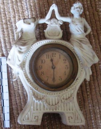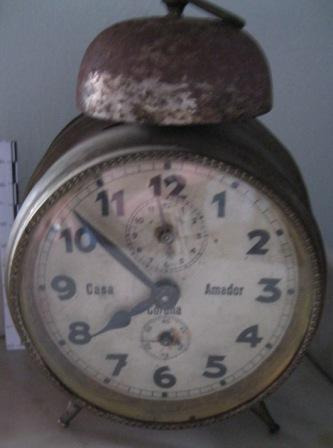 Reloxo espertador de sobremesa e de corda; con esfera independente para os segundos e para o espertador. Apoiado en dous pés, e na parte superior o timbre. Tapa da maquinaria cun debuxo inciso en forma de estrela de oito puntas.