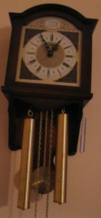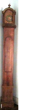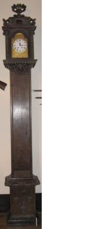 Reloxo de caixa alta en madeira de castiñeiro. Estilo Xurxo III. Na parte do reloxo so ten a esfera coa numeración. Incompleto, pola falta de maquinaria.