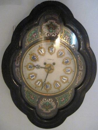 Reloxo mural, "ollo de boi", con mecanismo Morez, feito en París. A súa esfera oval é ondulada, con alma de madeira de piñeiro recuberta por lámina de alabastro nacarado. Vai salpicada no seu campo con ornamentación floral e xeométrica esmaltada con embutidos de nácara. Os números romanos van en cursiva inglesa, dispostos en cartuchos de porcelana orlados con cenefa acantiforme de latón dourado con cadanseu copete floral e de rocalla. As agullas son caladas, con tracería gotizante. Consta de dous orificios para dar corda. O marco, de estilo isabelino, é de perfil ondulado e está tallado en madeira ebonizada. A caixa, con tapa acristalada, é hexagonal, feita en madeira de piñeiro. É de apertura frontal e superior mediante unha bisagra e feche de femia. Conserva a chave para lle dar corda (para uns 8 días) no interior. Sonería sobre gong de péndulo (ben conservado) ás horas e medias.