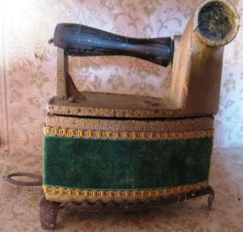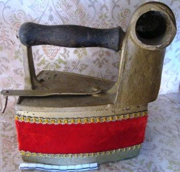 Ferro de pasar, fundido en ferro, para brasas ou carbón, do nº 9, forrada en veludo vermello e verde e adornos de pasamanería. Puño en madeira decorado con motivos florais. Ten cheminea.
