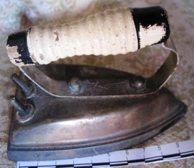 Ferro de pasar fundido en ferro, de cociña ou quecer, con puño de cor negra e decorado con motivos florais, do número "4". Nela aparece gravada a letra M enmarcada nunha C (ou sexa, 4 Centímetros)