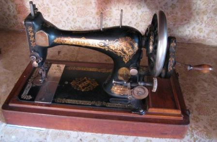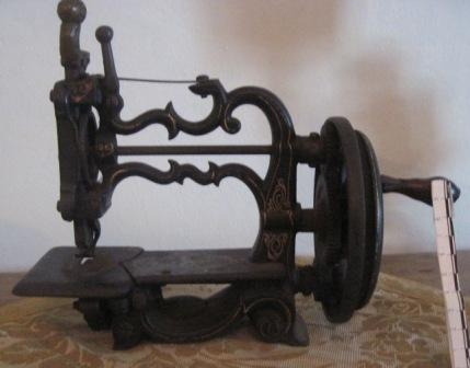 Máquina de coser manual de ferro fundido con filigranas e filetes en dourado como decoración en esmalte. O modelo é o da patente de Charles Raymond (1826-1904) do ano 1861 (a correspondente ao 30 de xullo), coñecida como Raymond Chainstitch Machine e producida na súa fábrica a partir de 1870.
