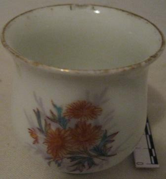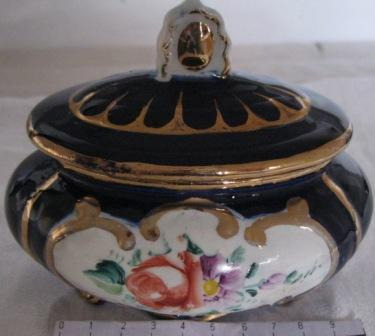 Caixa de toucador en porcelana bávara de fondo branco e decorada con motivos florais (pequenos ramalletes de rosas) e filetiños de ouro de raizame rococó.