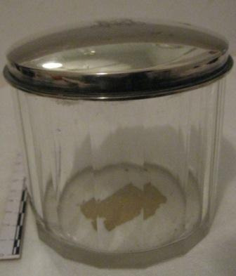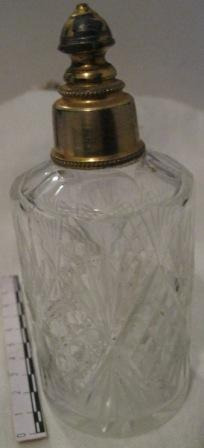 Frasco perfumador en cristal, reminiscente do estilo Imperio, organizado en cinco botes encaixados, coma un quebracabezas, nun plan cadrangular. O bote central é de planta cadrada. Preséntase arrodeado por catro frascos trapezoidais de esquinas recurvadas. Todos eles cinguidos por unha estrutura de metal, un soporte que consiste en dúas bandas ou frisos con decoración repuxada de puntas de folla de acanto, unidas en cada cara por dous grifóns de rabo acantiforme flanqueando unha representación dun terme coa deusa Lilit: unha figura feminina, de ás despregadas, sobre estípite. Salientan os tapóns dos frascos. O central leva unha tapa circular de folla de lata moldurada cun cerco superior con decoración incisa, e un pomo en forma de landra. Os recipientes trapezoidais levan anel de folladelata, embelecedor da boca, cun tapón prismático facetado.
