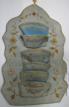 Semanario tarxeteiro coa alma de cartón forrada en tea azul e bordado con motivos florais en dourado. Conta con seis departamentos para cada día da semana co nome correspondente bordado en letra inglesa. Fáltalle o martes