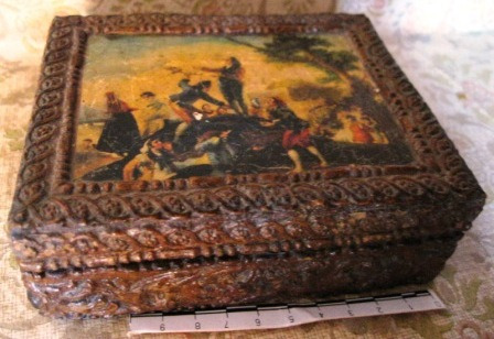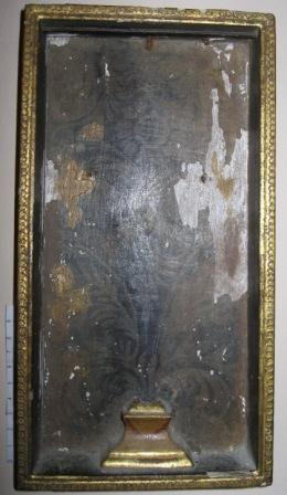 Caixa en madeira policromada con motivos vexetais en tons negros e dourados que nacen dunha peaña tallada en madeira; o borde da parte frontal en pan de ouro.