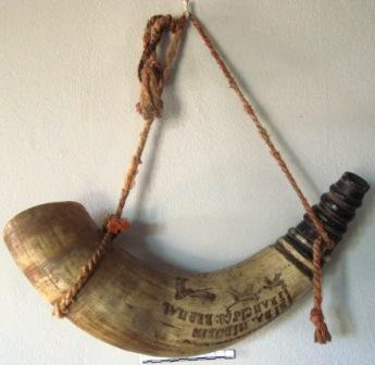 Corno de boi para chamar nas cacerías coa inscrición: "BIBA. MI DUEÑO FRANCISCO: BERNAL" e o pirogravado cunha escena cinexética. O cazador, Francisco Bernal, leva escopeta; en dirección contraria, fuxe unha lebre perseguida por un can. Vai asinado polo pastor que fixo a corneta: SATURIO (probablemente oriúndo de Soria)