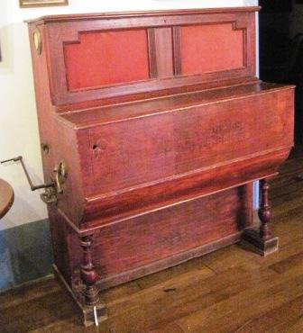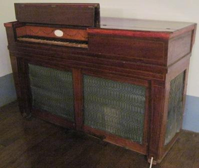 Piano organizado da casa inglesa Longman & Broderip en madeira de caoba, teclado laminado en marfil. Na parte inferior enreixado con arame de bronce e feltro verde. Os dous pedais en ferro. No frontal, orla oval de grilanda floral, cartucho decorativo da marca de marquetería. Fileteados de marquetería fina no corpo frontal e laterais.