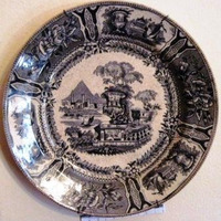 - Prato chan en louza de Sargadelos, decorado con estampado modelo "Góndola". Na orla da ala, alternancia de viñetas de paisaxe imaxinaria e rosas. 3ª ou 4ª Época (1845-1862/1870-1875).