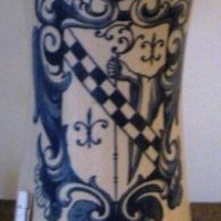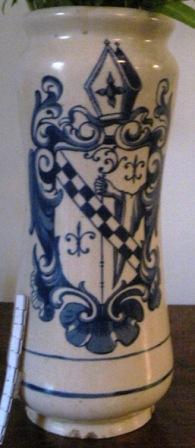 - Albarelo empregado coma floreiro. En cerámica branca, é de corpo cilíndrico, con lixeira convexidade no fuste. Presenta bocel no beizo, boca exvasada e escocia no pé. No corpo, escudo heráldico en tons azul cobalto, coidamos que pertencente á congregación do Císter ou Regular Observancia de San Bernardo: cuartelado, unha banda xaquelada de dobre serie de escaques, sementado de dúas flores de lis, unha no cantón destro do xefe, outra na siniestra, brazo de monxe con cogula branca empuñando báculo abacial, movente do flanco siniestro da punta. No xefe, a mitra a modo de timbre. Cerco ornamentado con volutas e cuncha de rocalla na punta. Semella da serie talaverá coñecida como "monástica" ou "heráldica". Véxanse as notas.