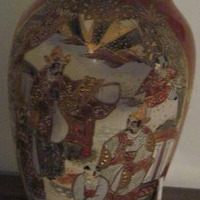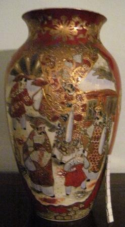 - Floreiro Satsuma de cerámica craquelada e esmaltada, con corpo ovoidal que se estreita a partir dos ombreiros. De colo estreito e boca exvasada, vai decorado con escenas de personaxes xaponeses do Shogunato e motivos florais en relevo en tons granates, dourados e brancos. Fai parella coa peza 404.