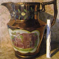 - Xerra de cerámica de Bristol de reflexos dourados con dúas escenas familiares nunha contorna do rural dezaoitesco inglés e motivos vexetais.