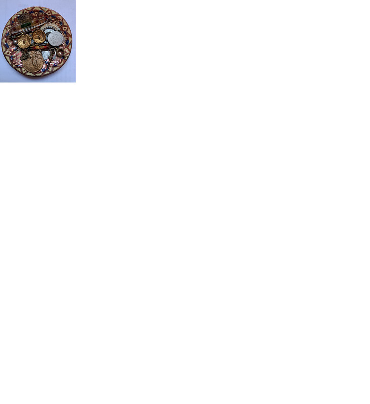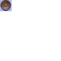 - Pratiño semifondo de louza cocida con cuberta de esmaltes estanníferos de reflexos metálicos tipo mudéxar, cor cobre, e pinceladas azul cobalto que debuxan unha flor octopétala. Na corola, que ocupa o centro mesmo do prato nun lixeirísimo umbo (reminiscente da produción renacentista de Manises), unha estrela de David coa bisetriz marcada. No campo dos pétalos altérnase a decoración de reflexos acantiformes coa de losanges, raiados cun pinxante diagonal, finxindo perspectiva.