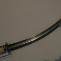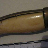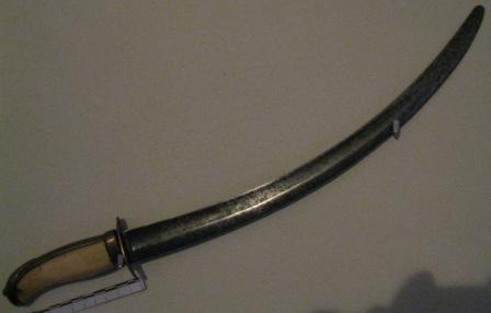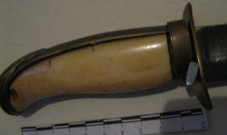 - Gumía árabe con empuñadura en bronce labrado con motivos vexetais e marfil. Folla en ferro curva dun só fío.
