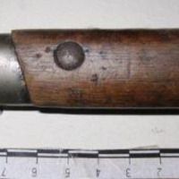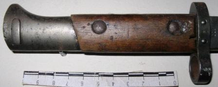 - Baioneta. Modelo tipo machete para máuser época da Grande Guerra con empuñadura en bronce e madeira; folla dun só fío.