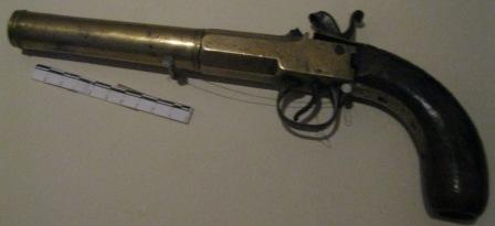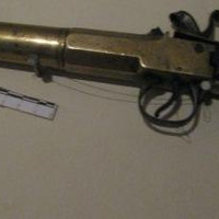 - Pistola de pistón con culata en madeira e canón en bronce e gatillo en ferro.