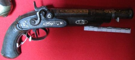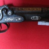 - Pistola de avancarga de pistón, canón en ferro con filigranas prateadas e con inscrición. Culata en madeira.