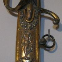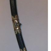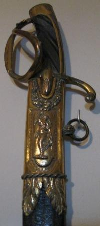 - Sabre de oficial composto de puño en madeira e gardaman de tres gabiáns con folla curva dun só fío, vaíña en pel con apliques en metal repuxado bañado en ouro. Decoración figurativa dunha ménade danzante e da alegoría da Prudencia.