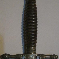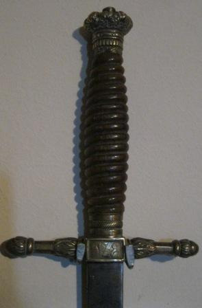 - Espadín de cruz ou arraz rematada en flor con empuñadura de hasta e bronce rematada nunha coroa e coas iniciais gravadas "VE". Lamia lisa e dunha mesa