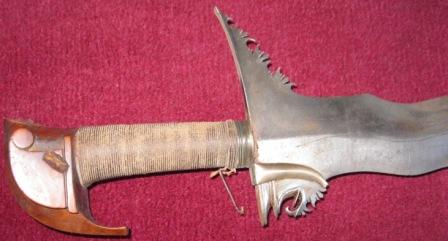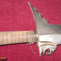 - Espada de folla zigzagueante e empuñadura rematada en madeira. Kriss de posible orixe filipino, probablemente de Malaisia. A espada é corta de folla sinuosa, acanalada e de filos paralelos que se ensancha na súa base para ensamblarse con outro elemento que serve de garda á man; unha forquiña que se fixa á empuñadura e traba ambas pezas suxeita o conxunto. A empuñadura é de madeira e está recubierta por un tecido trenzado.