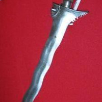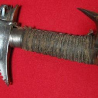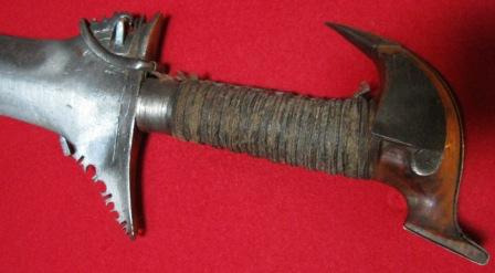 - Espada de folla zigzagueante e empuñadura rematada en madeira. Kriss de posible orixe filipino, probablemente de Malaisia. A espada é corta de folla sinuosa, acanalada e de filos paralelos que se ensancha na súa base para ensamblarse con outro elemento que serve de garda á man; unha forquiña que se fixa á empuñadura e traba ambas pezas suxeita o conxunto. A empuñadura é de madeira e está recubierta por un tecido trenzado.